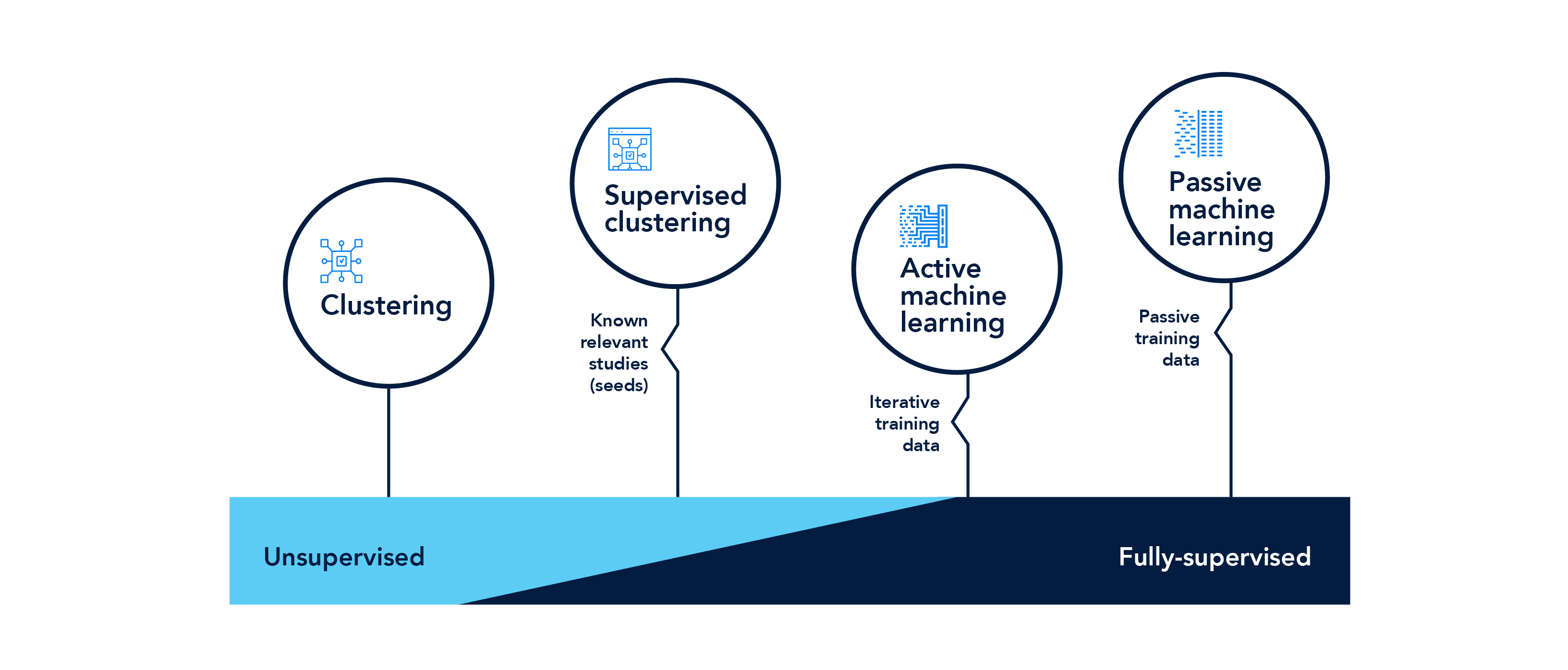 Cluster studies by common words or text similarities. Users can create keyword hierarchies to review document clusters with the most relevant keywords or use seed references to identify clusters containing high proportions of relevant literature to target manual screening efforts.